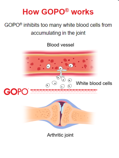 GOPO® works by discouraging large numbers of white blood cells from accumulating in the joint, therefore breaking the vicious cycle and alleviating pain.